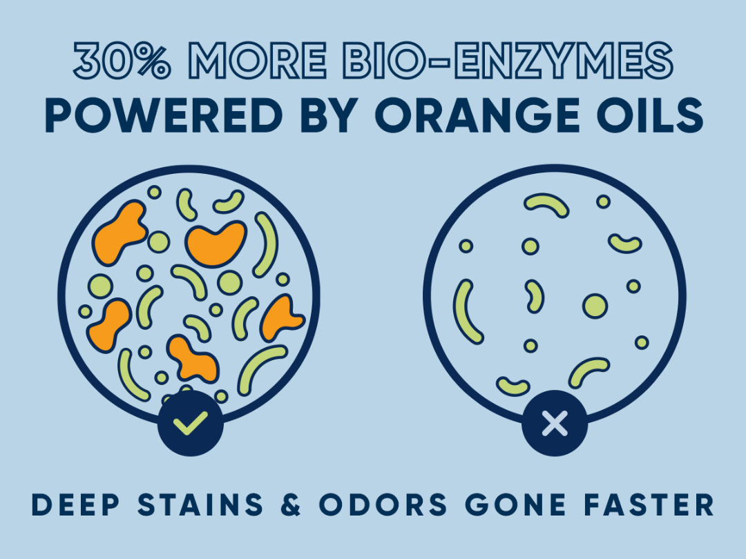 Powerful Pet Stain Remover: Organic Orange uses our trusted Bio-Enzymatic formula with the cleaning power of citrus to eliminate the toughest stains caused by pets or people. Vomit, blood, poop, urine, drool stains, and odours will be broken down, digested, and gone for good.